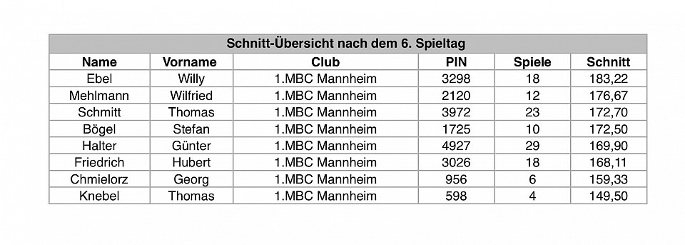 Heute hat unser Club, 1. MBC MANNHEIM gezeigt, dass er doch Verbandsliga tauglich ist. Endlich gab es wieder einmal einen Mannschafts Schnitt von 185 über alle fünf Spiele. Zudem wurde nicht nur ein Spiel gewonnen – wie zuletzt an fast allen Spieltagen - sondern, man kann es kaum glauben, alle fünf Spiele.